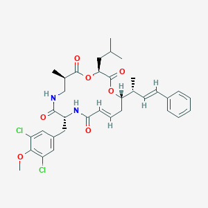 | 10604522 | C35H42Cl2N2O7 | 673.6 | CC1CNC(=O)C(NC(=O)C= CCC(OC(=O)C(OC1=O)CC (C)C)C(C)C=CC2=CC=CC =C2)CC3=CC(=C(C(=C3) Cl)OC)Cl | C[C@@H]1CNC(=O)[C@H](NC(=O)/C=C/C[C@H](OC(=O)[C@@H](OC1=O)CC(C)C)[C@H](C)/C=C/C2=CC=CC=C2)CC3=CC(=C(C(=C3)Cl)OC)Cl | 672.236907 |